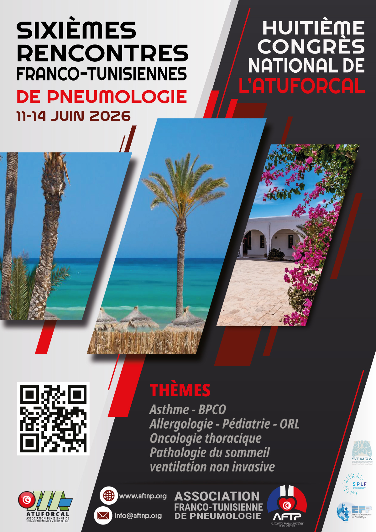 Au nom de l'Association Franco-Tunisienne de Pneumologie (AFTP) et de l'ATUFORCAL, nous avons l'honneur et le plaisir de vous accueillir pour ces 6èmes Rencontres Franco-Tunisiennes de Pneumologie & 8ème Congrès National de l'ATUFORCAL qui se déroulent du 11 au 14 juin 2026 à Djerba.